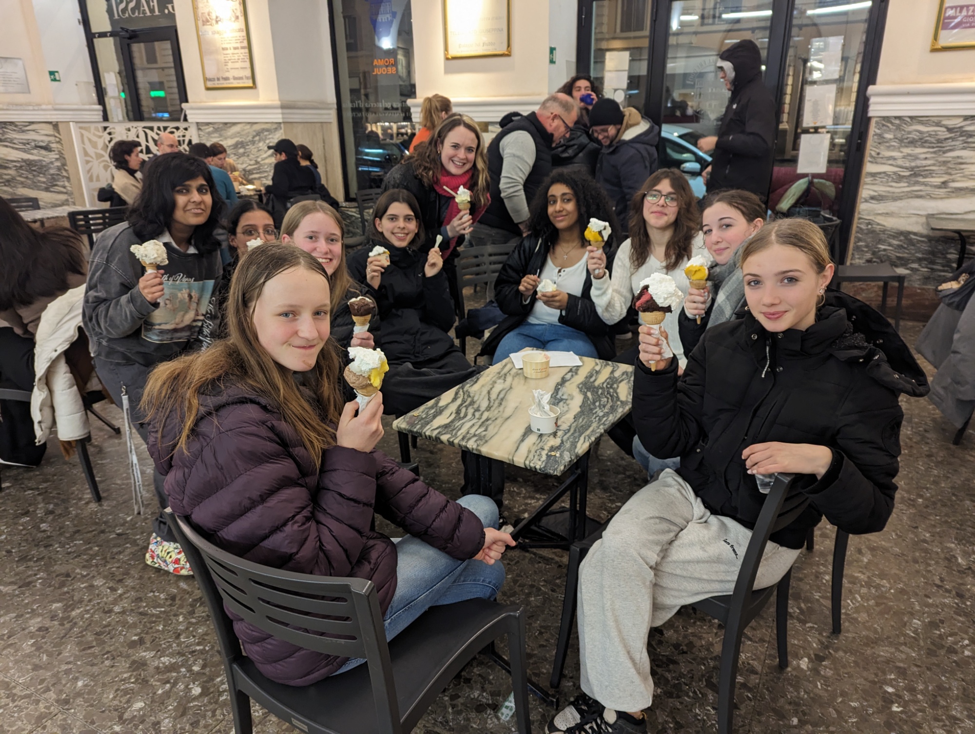 Despite the rain and the almost 30,000 steps taken each day, there was not a moment when students weren't smiling, singing, gasping and asking questions. Energised by huge breakfasts of croissants, pancakes, fruit and coffee, followed by a steady diet of pizza, pasta and gelato, we took in all the sites of the ancient city: the Colosseum, the palaces of the Palatine Hill, the temple of Vesta in the Forum, the Pantheon, the temple of Hercules besides the river Tiber and much more. We even traced the path of an aqueduct which snakes through the the basement of a fancy shopping centre, and emerges from the Trevi Fountain.